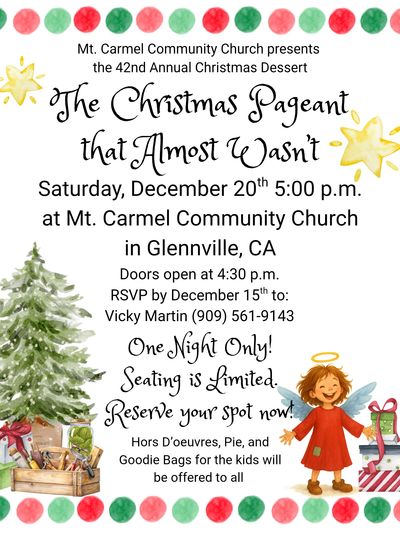 We welcome all who can attend! Hors D'oeuvres will be served alongside delicious homemade pies and fudge while we enjoy the company of our neighbors and a special Christmas message from our church family.